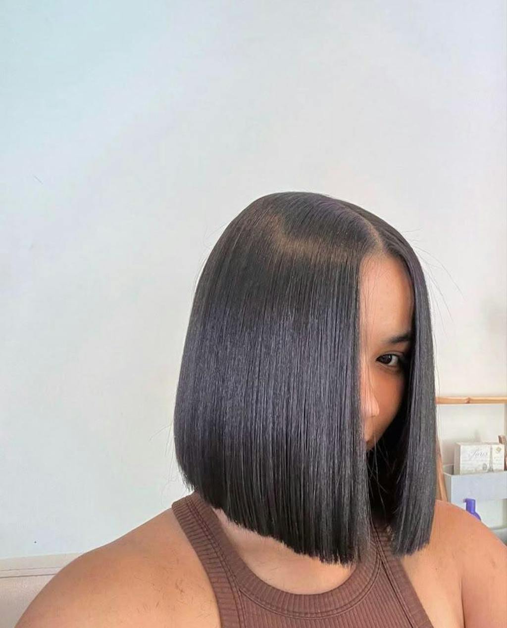 3.Hold the wig by the sides, place it at your forehead, and slide it back, positioning it just past your natural hairline.